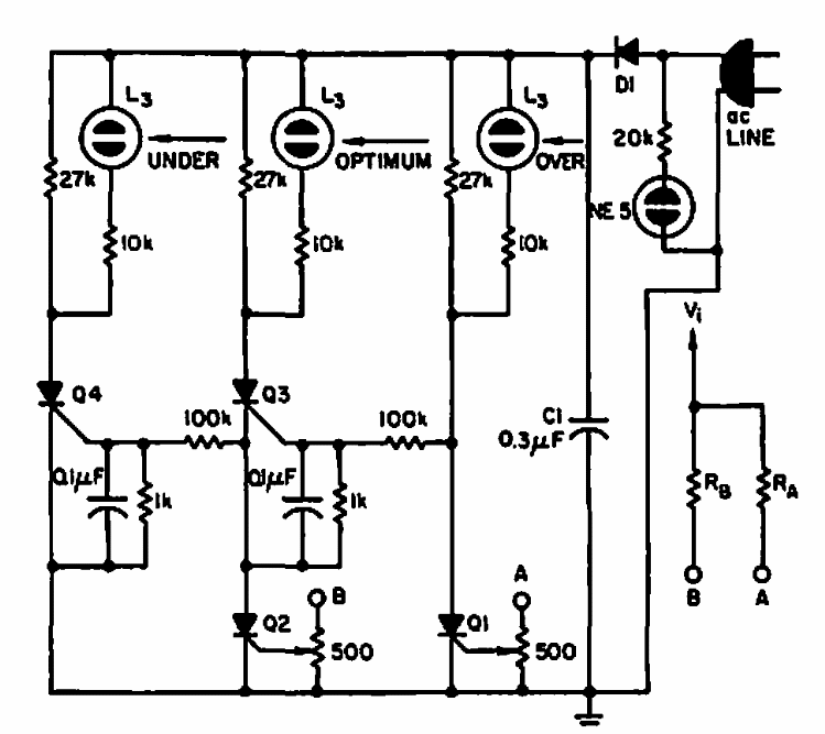 This circuit is intended for detecting 3 levels power grid voltage, and it can be adapted to operate with the most diverse voltages. The circuit uses neon indicator lamps.