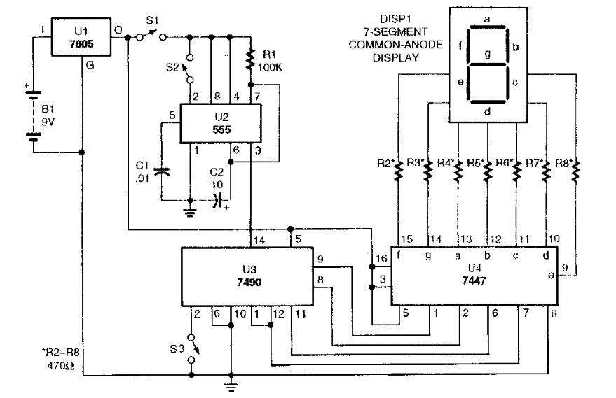 Found in a Popular Electronics from the 1990s, this circuit is a 1-digit counter that advances under the command of S2. The circuit can be expanded to more digits.