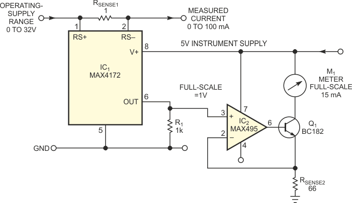 Utilizing the MAX4172 or MAX495 integrated circuit, this circuit increases the sensitivity of a full scale 10 mA movable iron or movable coil gauge with characteristics given in the diagram.