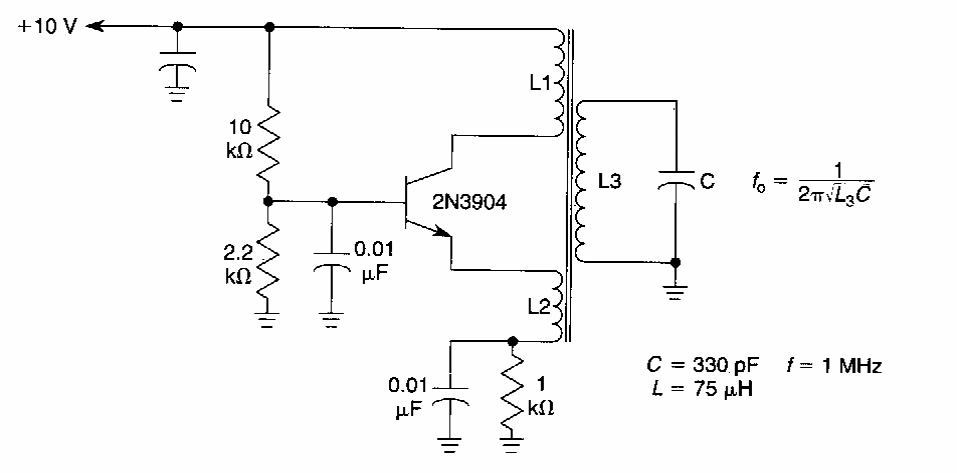 This inductively coupled oscillator was found in an American documentation from the 90's. The circuit with the indicated components generates a 1 MHz L1 signal typically has 10 times the number of turns of L3.
