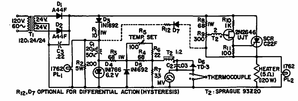This circuit was found in an old GE manual. It uses a thermocouple as a sensor. The SCR must be in accordance with the power of the controlled load.