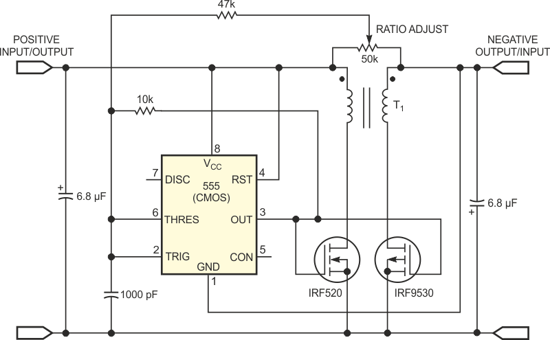 This interesting circuit was found on the Internet and is based on the 555. The circuit uses power MOSFETs that determine its output. No information about the transformer was provided.
