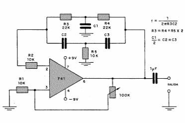 In the figure we have the typical configuration of a sinusoidal audio oscillator with twin-T. The frequency is given by the twin-T and can be calculated by the formulas next to the diagram.