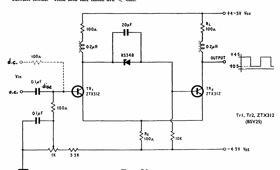 Found in the 1974 Ferranti transistor manual, this Schmitt trigger circuit uses general-purpose transistors of the time.