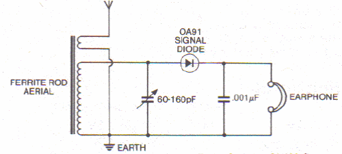 This crystal or galena radio circuit uses a high impedance magnetic earphone. The coil can have 80 + 20 turns of wire 28 on a ferrite rod.