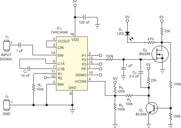 Based on NXP 74HC logic, this circuit can be adapted for various uses. The circuit can also be used with 12V power, and the circuit replaced with a common 4046 PLL.