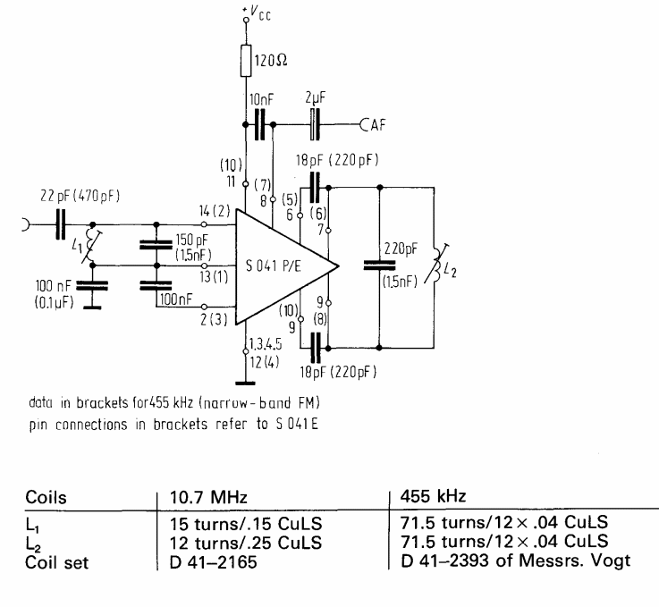 Found in the 1976 Siemens transistors manual, this circuit works with AM or FM IF signals. In the diagram information is given for the coils.