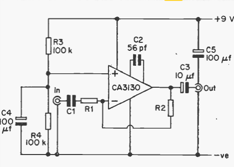 Using a CA3130 this preamp has excellent gain. The power supply does not have to be symmetrical. The ratio between R2 and R2 determines the circuit gain.