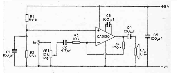Found in an English publication from 1977 this audio amplifier provides an output of a few milliwatts in a small speaker. The power supply does not have to be symmetrical.