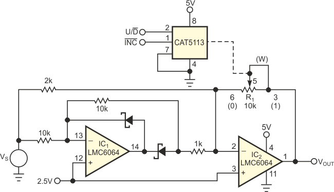 Based on ON Semiconductor's CAT5113, this circuit has the additional purpose of gaining test and measurement amplifications.