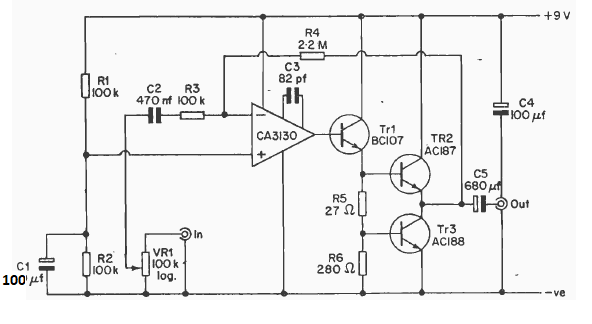 This amplifier with the AC187 and AC188 pair and the CA3130 integrated circuit was found in an English publication from 1977. The circuit does not need a symmetrical power supply.