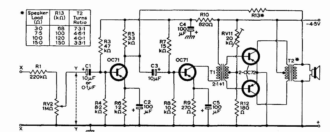 This 4-transistor amplifier can work from 4.5 or 6 V power supplies. We found it in a Mullard transistors manual from 1960. The transistors are from the time.