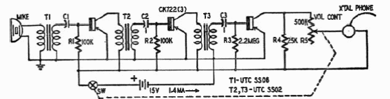 This circuit is from a 1954 transistors publication. The transistors are the CK722 among the first commercial types available on the market. Transformers are special miniature types, common at the time.