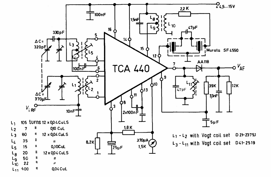 We found this receiver on a single chip in the 1976 Siemens integrated circuits manual. The circuit is of the super heterodyne type using ceramic filter in the IF.