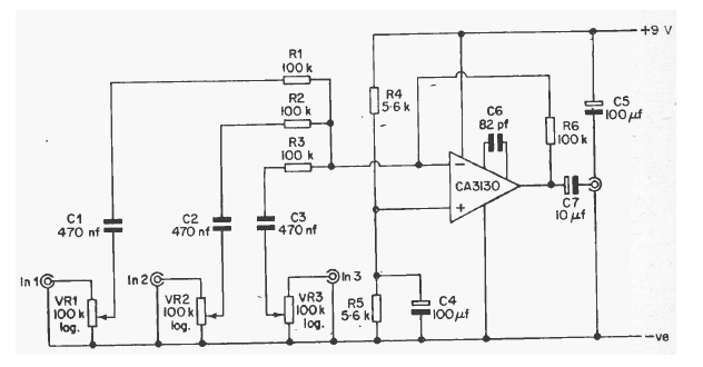 This mixer with the integrated circuit CA3130 was obtained from an English publication from 1977. The power source does not need to be symmetrical, and the circuit has 3 inputs.