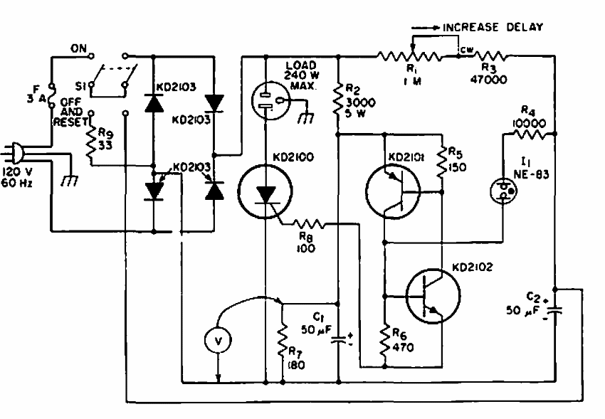 This timer can control loads up to 240 W. We found it in a 1967 RCA documentation. The main components admit modern equivalents.