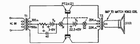 Taken from a 1954 book by Rufus Turner, this amplifying step with PT2A transistors provides an output of a few tens of milliwatts. The circuit can be adapted to use modern transistors.