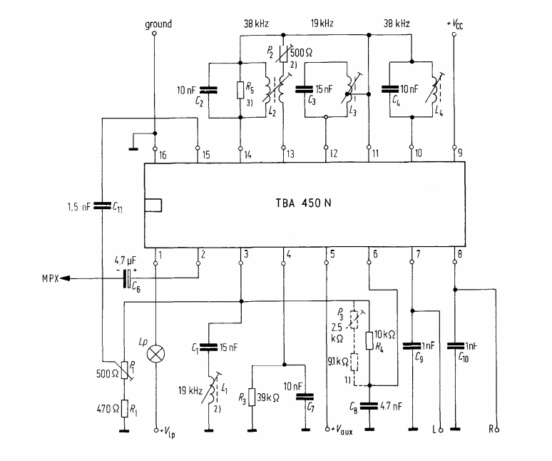 In the figure we have the typical circuit of a stereo decoder using the TBA450N integrated circuit. The circuit is from the 1976 Siemens manual. No information was given on the coils.