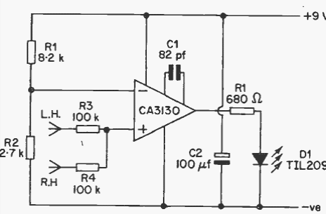 This peak indicator for stereo amplifiers uses a CA3130. The 80's circuit does not need a symmetrical power supply.