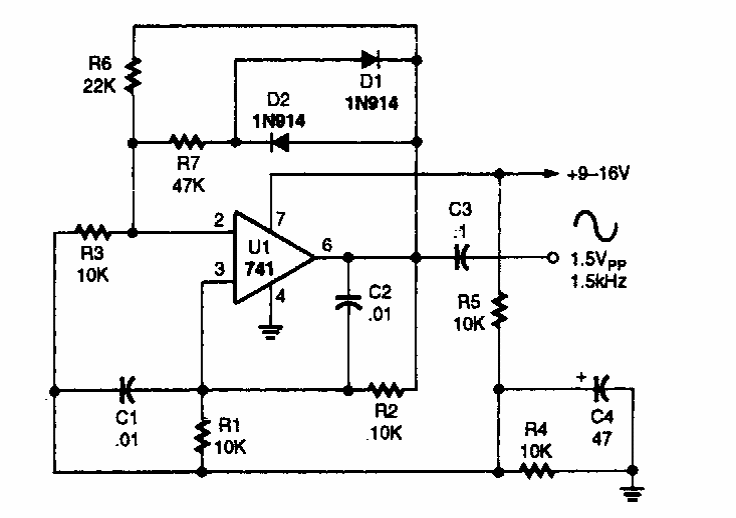 Found in a Popular Electronics from the 90s, this Wien bridge oscillator uses a single-source operating. The frequency can be calculated from the formulas in the previous circuit.