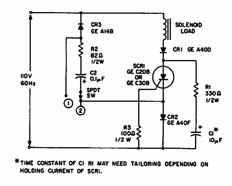 This circuit is intended to trigger SCRs on the positive half cycle for solenoid control. The circuit is from the 1967 General Electric SCR Manual.