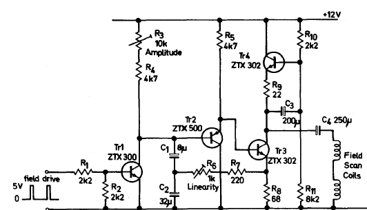 This circuit was found in Ferranti's 1974 transistor manual. The circuit source a sawtooth signal to the deflection coils of a cathode ray tube.