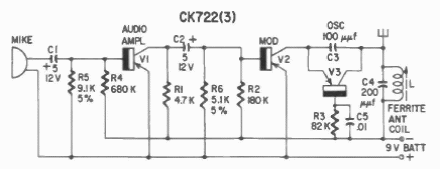 With this name, we find in a documentation by Hugo Gernsback from 1960 this small transmitter for the medium wave band. The transistors are the CK722, and the range is a few meters.