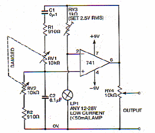 This Wein bridge oscillator as it is also known uses a 741 with symmetrical power. With the indicated components it provides sine signals from 150 to 1500 Hz.