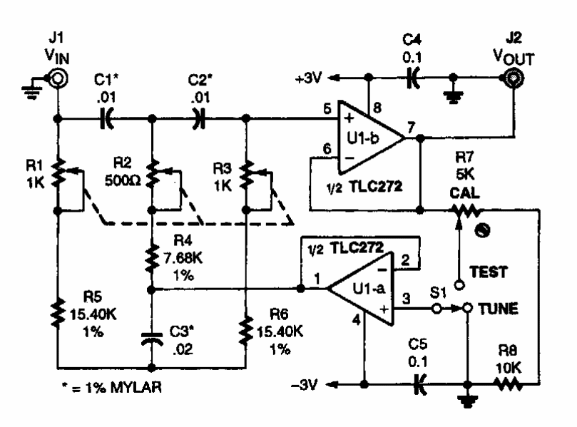 Found in a Popular Electronics from the 90s, this circuit is intended to measure the harmonic distortion of an audio signal. The circuit can be tuned between 970 and 1030 Hz.