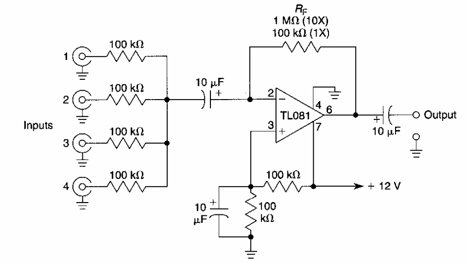 We found this mixer in an American documentation. Operational amplifier supports equivalent and changed number of inputs. Power can be between 6 and 12 V.