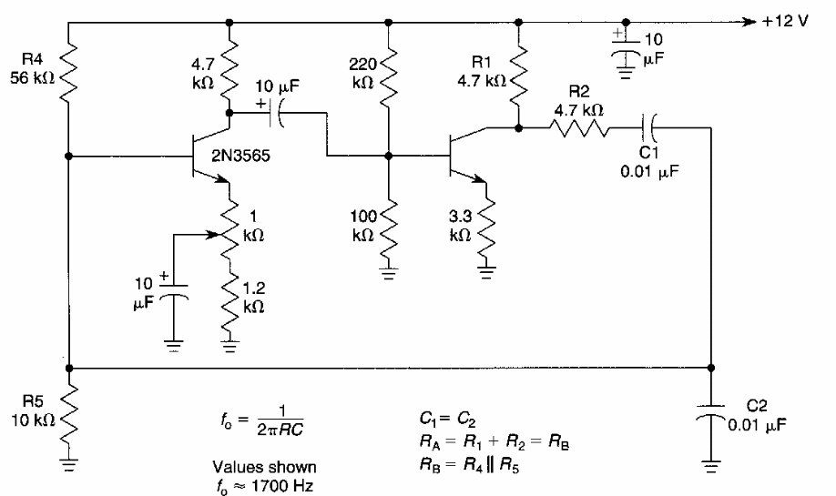 This circuit was found in old American documentation. It is a Wien bridge with the component values calculated by the formulas next to the diagram.