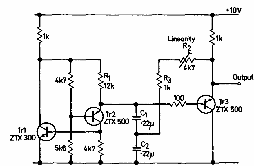 This circuit has a correction or linearity adjustment. We found it in Ferranti's transistor manual from 1974. Transistors are general-purpose types at the time.