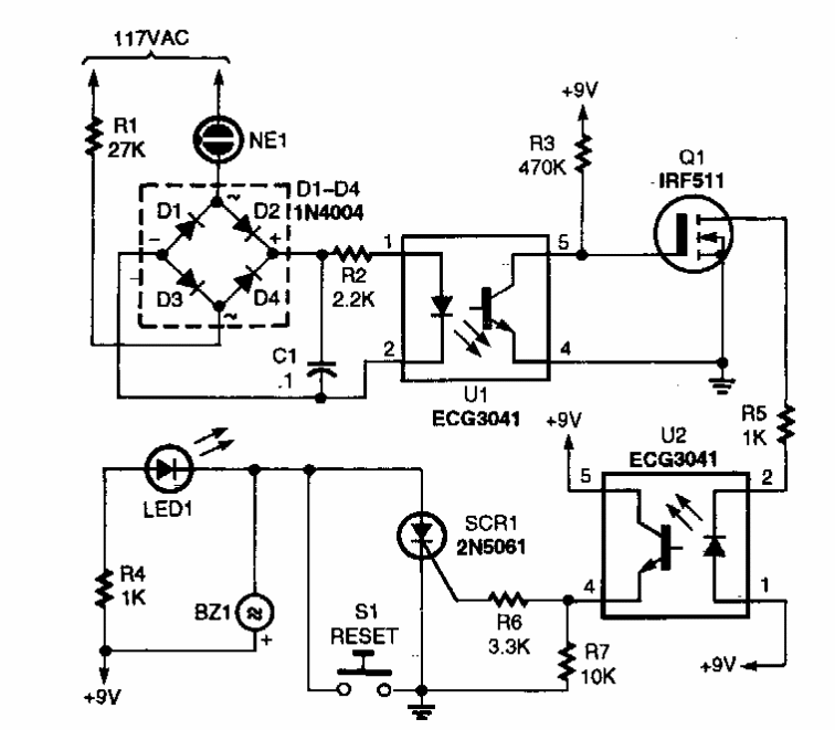We found this circuit in a Popular Electronics from the 90s. Its purpose is to monitor a power line. The circuit uses optical couplers of the time.