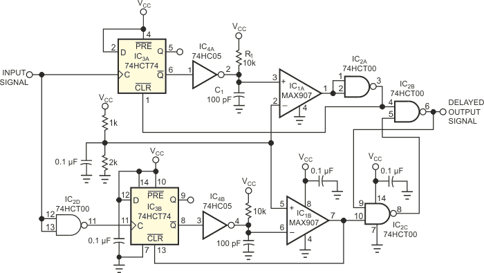 This TTL delay circuit has long delay times which can be determined by R1 and C1. The base is in common TTL and Maxim's MAX907.