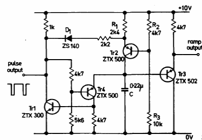 Found in Ferranti's 1974 transistor manual, this circuit is a self-oscillating version of the previous one. Transistors are common types at the time.
