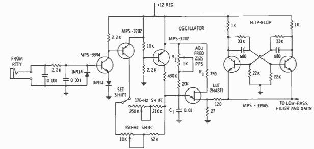 This circuit using only transistors was found in documentation from 1977. The frequency is 4250 pulses per second. Components can be switched to other frequencies.