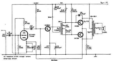 Found in a Mullard Manual from 1960, this circuit contains a transistor push-pull output being driven by a common triode in a tube amplifier.