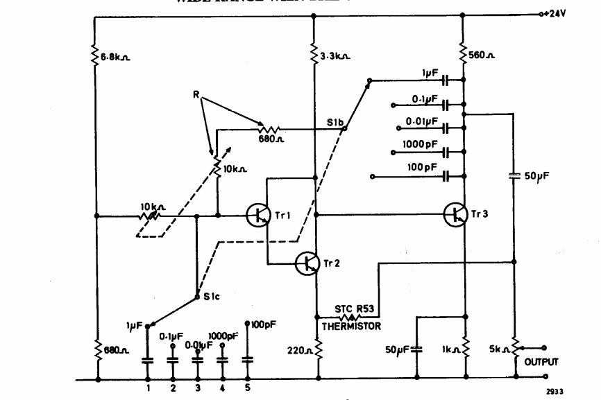 This Vienna bridge multi-band oscillator circuit was found in a 1974 Ferranti transistor manual. The circuit generates signals from 25 Hz to 1 MHz in 5 bands selected by the capacitors.