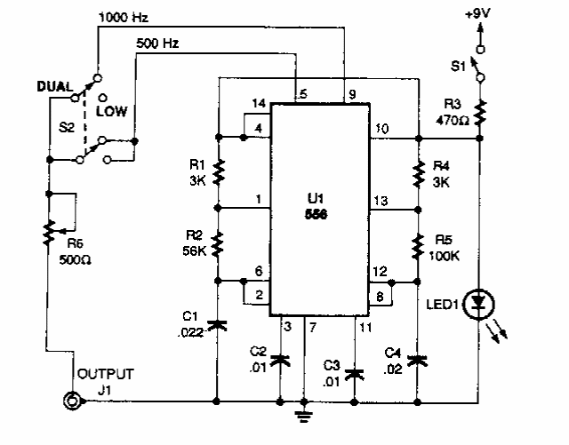 Found in Popular Electronics from the 90s, this circuit generates two tones that are selected by a switch. The circuit is used for testing audio equipment.