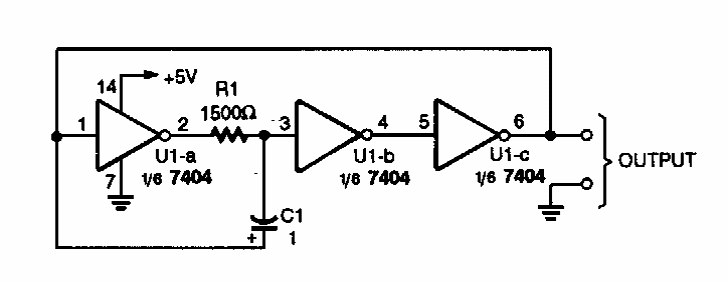This 1 kHz TTL oscillator uses 3 inverters of a 7404 integrated circuit. The circuit is from a Popular Electronics from the 90s.