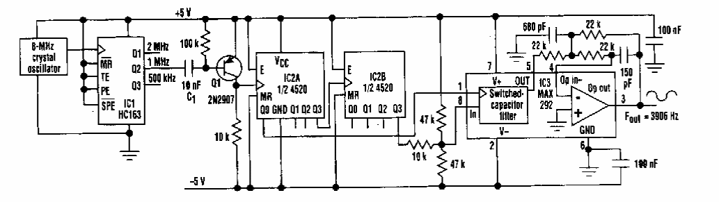 Found in an Electronic Design from the 1990s, this circuit generates signals from 500 kHz to 1 MHz that are digitally synthesized to provide a sinusoidal output.