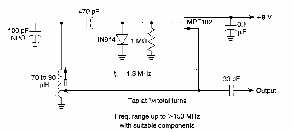 Found in American documentation from the 90's, this circuit oscillates up to 150 MHz. The transistor supports an equivalent and the diode is general-purpose.
