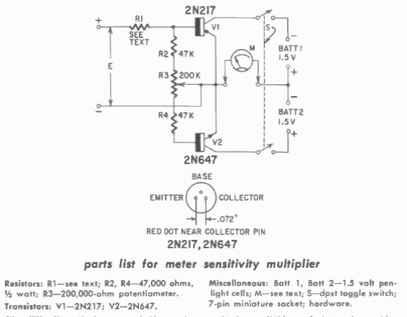 We found this circuit for increasing the sensitivity of an instrument in a 1960 documentation. The transistors are from the time and the power supply is symmetrical.