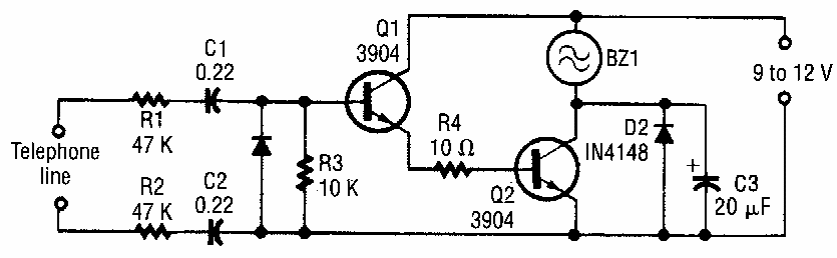 This circuit was found in an old Electronics Now. The transistors are general- purpose and the circuit is powered by an external source.