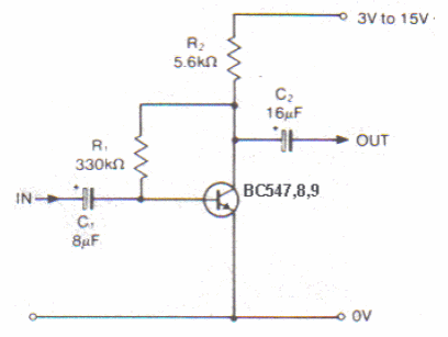 In the figure we have a simple amplifier stage for BC547 series transistors. The gain is approximately 200 times with a 9V supply.