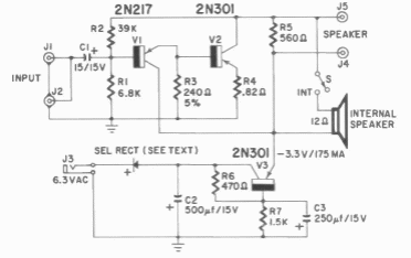 Found in a publication by Gernsback from 1960, this circuit makes use of germanium transistors of the time. The power is on the order of a fraction of a watt despite using a larger power transistor.