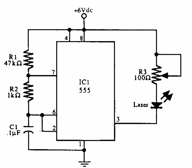 This pulsed circuit was found in documentation from the 1990s. The circuit has a wire potentiometer for adjusting the intensity of the pulses.