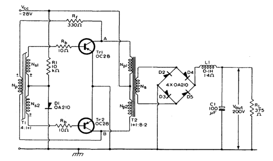 We found this circuit in Mullard's 1960s transistor manual. No information about transformers is given. Transistors are germanium types of the time.