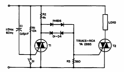 This circuit was found in an Electronic Design from 1967. The circuit uses two triacs being T2 according to the power of the load that must be controlled.