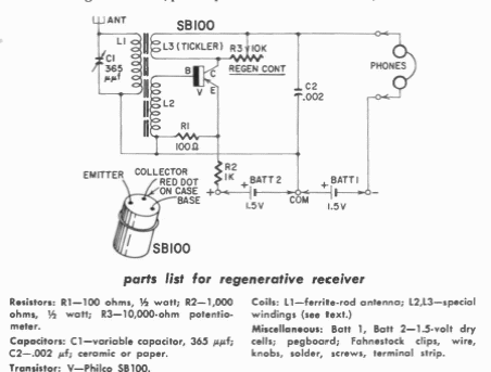 Indicated for the medium wave range, this receiver was found in a publication by Gernsback from 1960. The transistor is germanium of the time and the headphones are of high impedance.